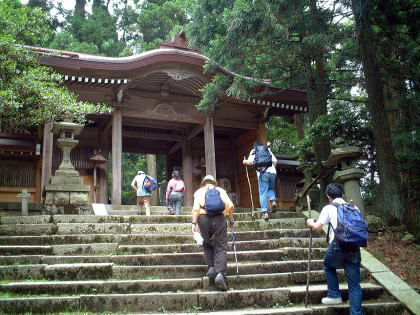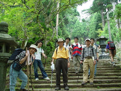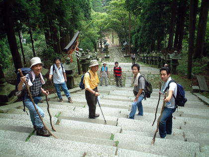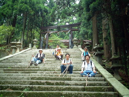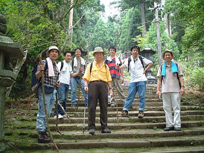 | 最後のの石段を登ると本殿に着く | 写真では分からないが皆汗だくだく | ||